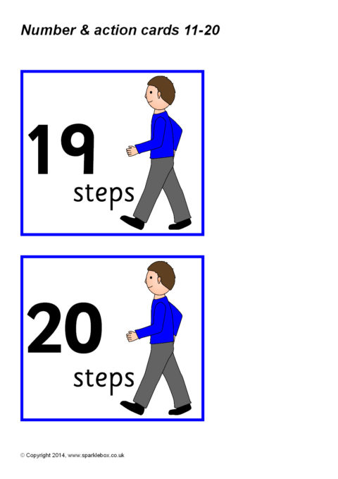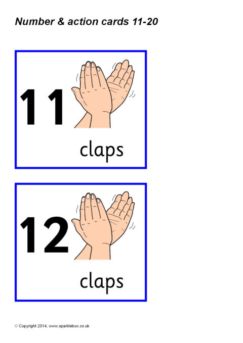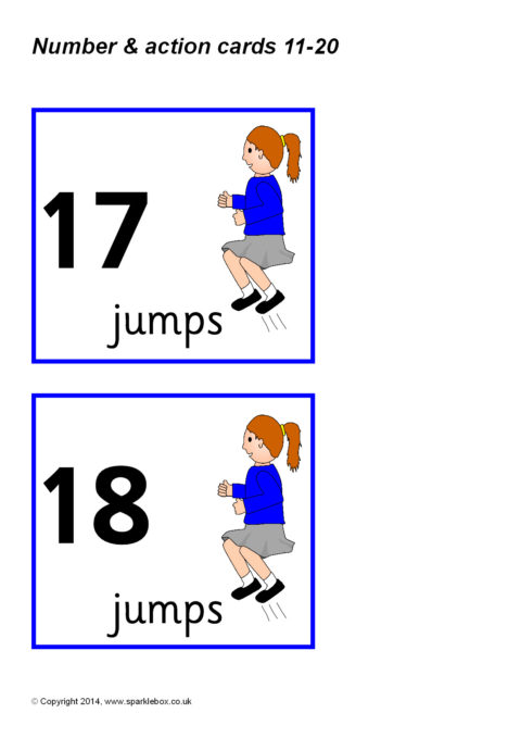 A set of printable cards with numbers from 11 to 20 and various physical actions such as jumping, clapping, tapping and hopping. Pupils read the number and do the action the corresponding number of times.