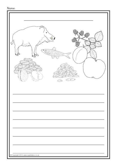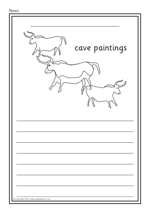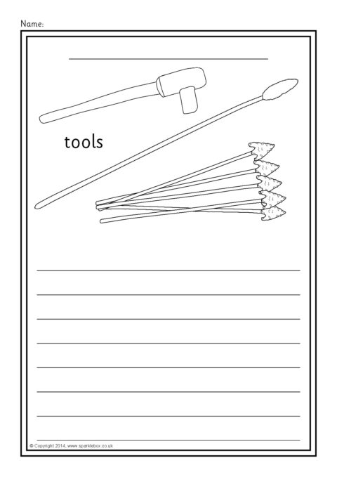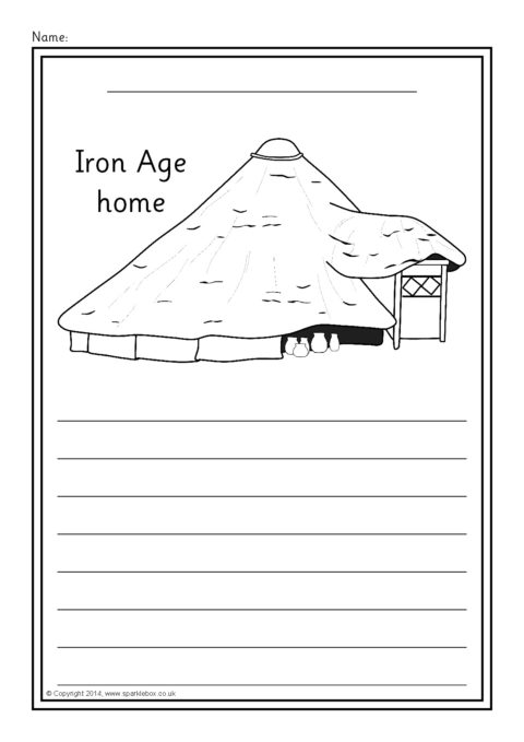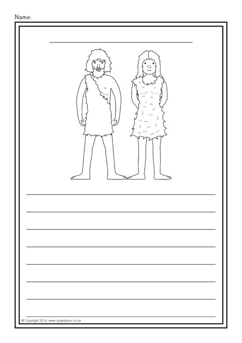 A set of simple printable sheets featuring images of items associated with Prehistoric Britain for children to colour along with writing lines for topic-related writing.