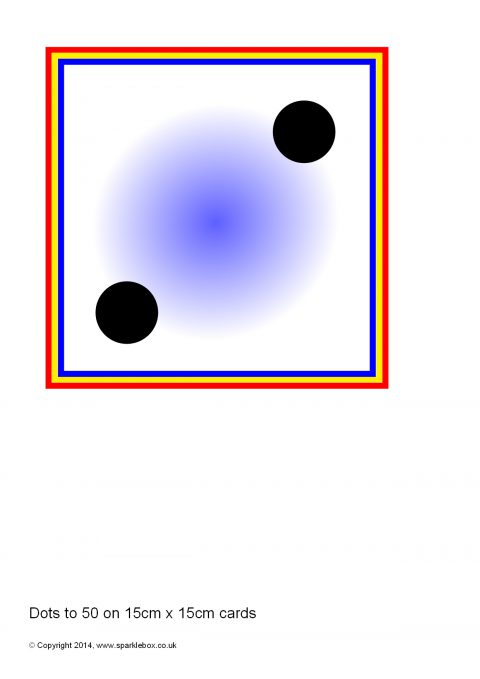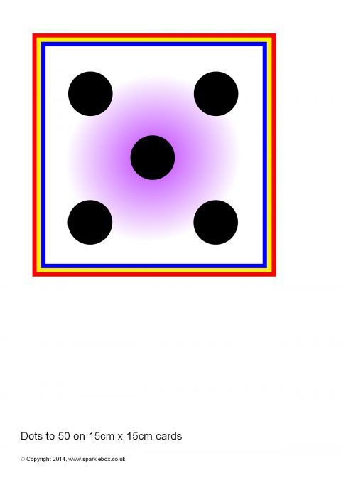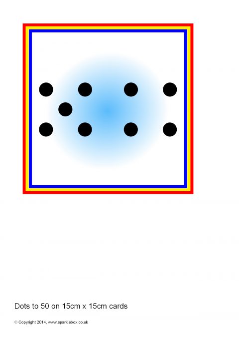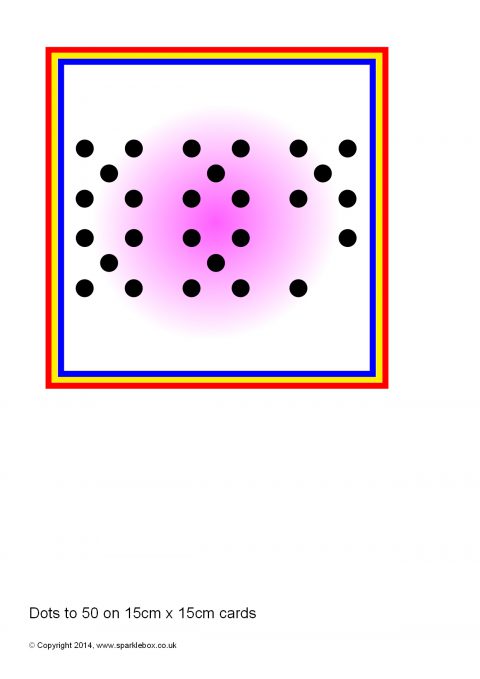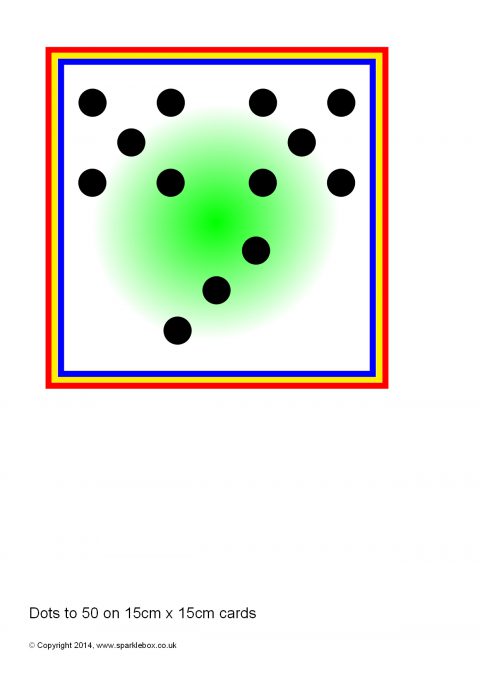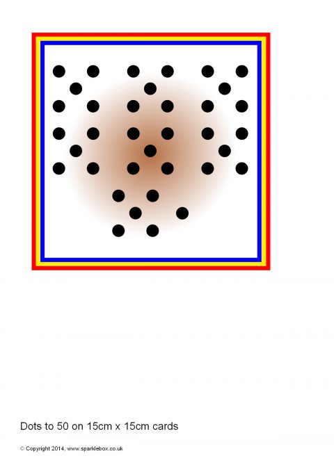 Multi-use printable cards with sets of dots from 0 to 50. Each card is 15cm by 15cm and can be used for all sorts of card-based activities.
