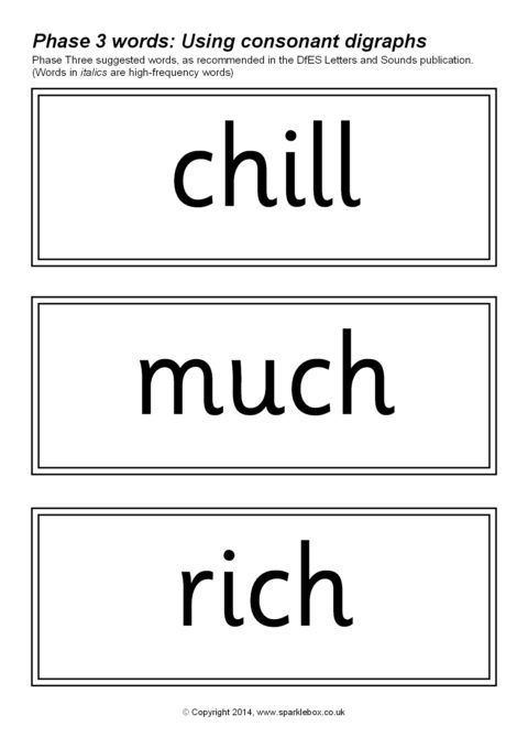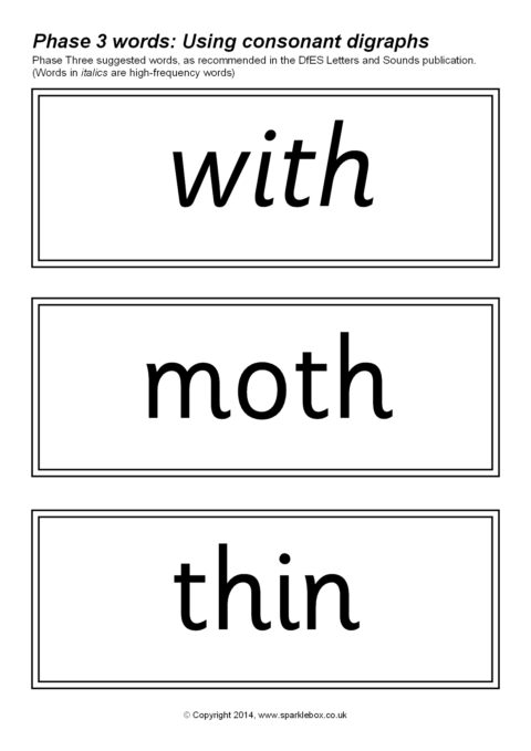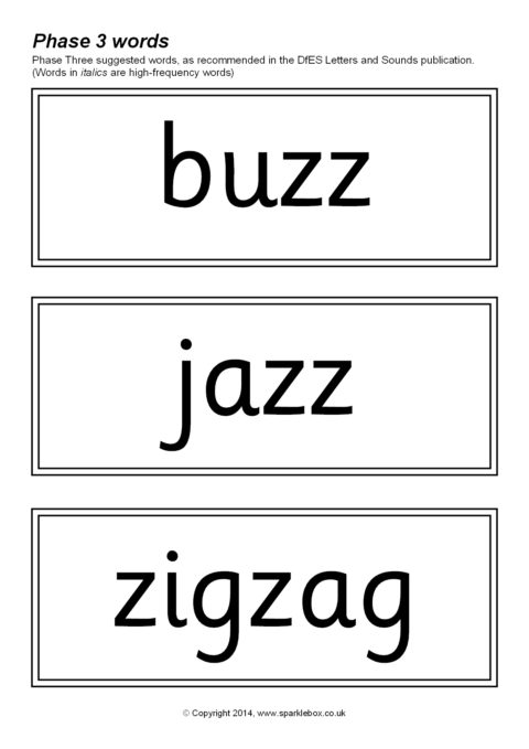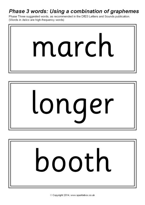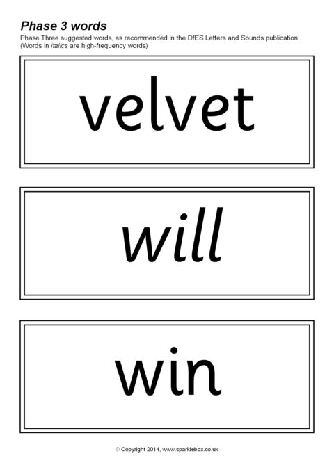 A PDF with flash cards (3 to a page) featuring over 270 suggested words from Phase Three outlined in the DfES Letters and Sounds publication. Ideal for use in conjunction with phonics games or for displaying in your classroom.