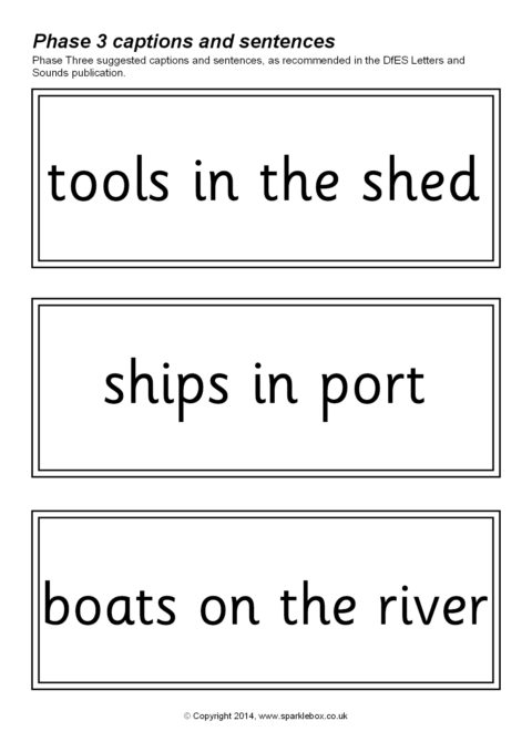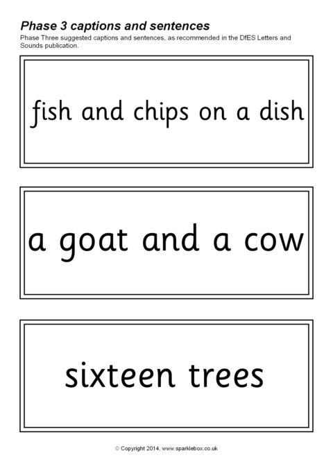 20 printable cards featuring suggested captions and sentences as outlined in Phase Three of the DfES Letters and Sounds publication.