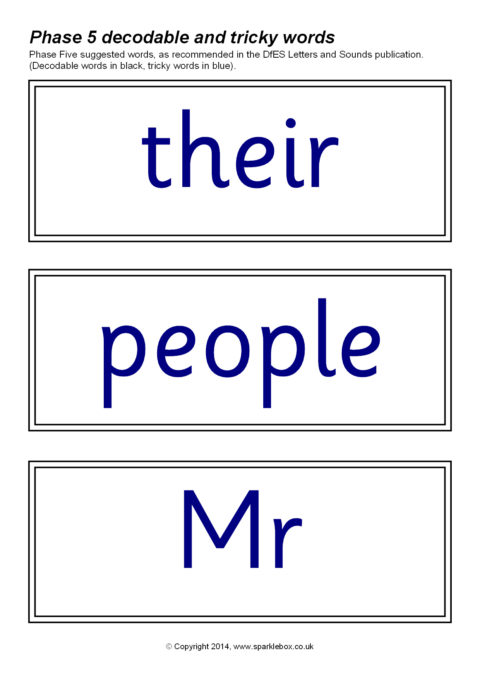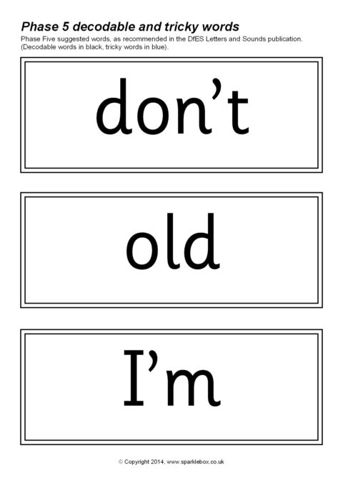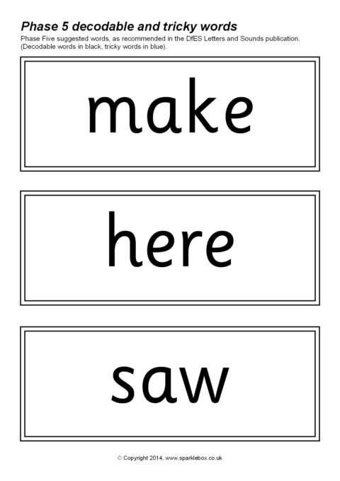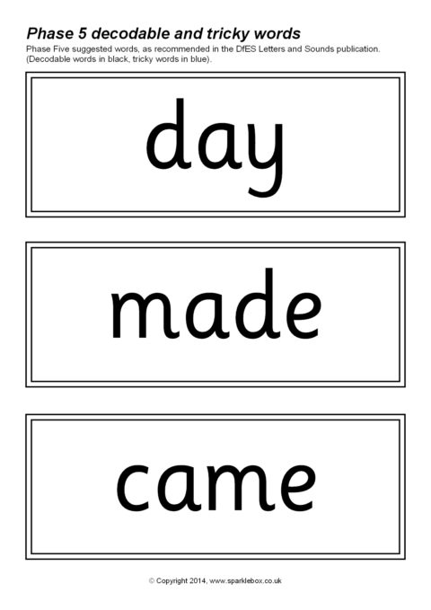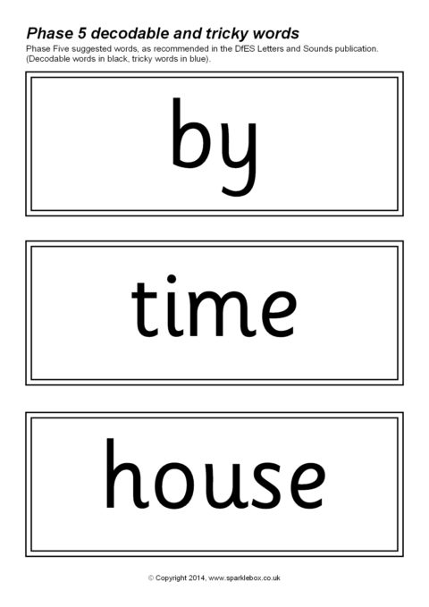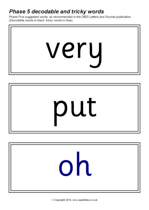 The decodable and tricky words for Phase Five as specified in the DfES Letters and Sounds publication.