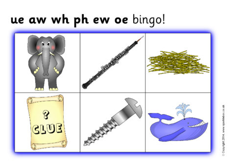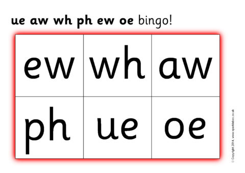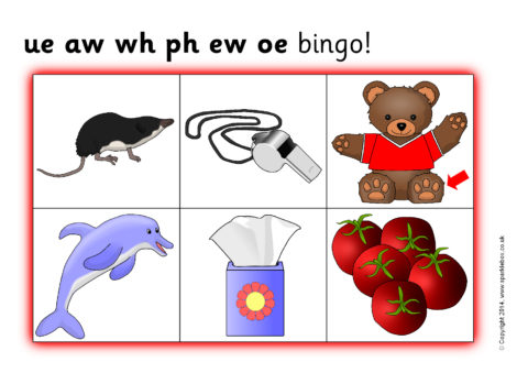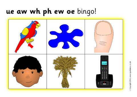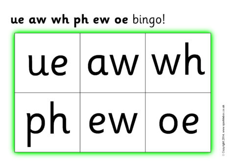 A set of printable bingo boards and cards using the phonemes ue, aw, wh, ph, ew and oe. The set consists of 4 different letter boards and 4 different picture boards as well as picture and letter cards. The game can be played by matching pictures to letters, or letter to pictures.