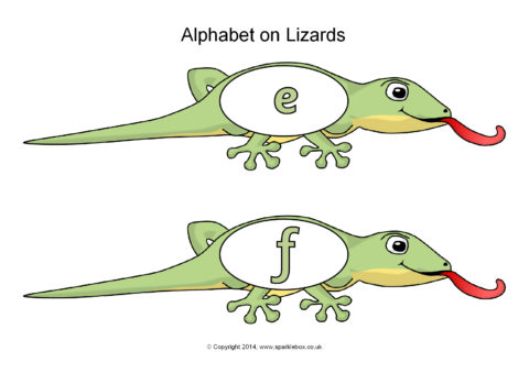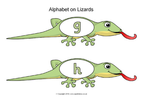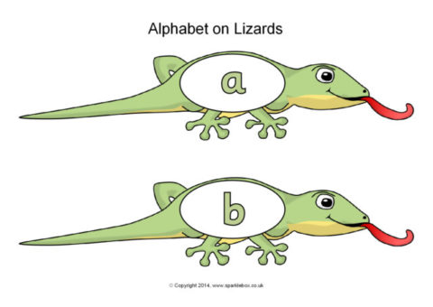 The lowercase alphabet letters A-Z presented on lizard characters.
