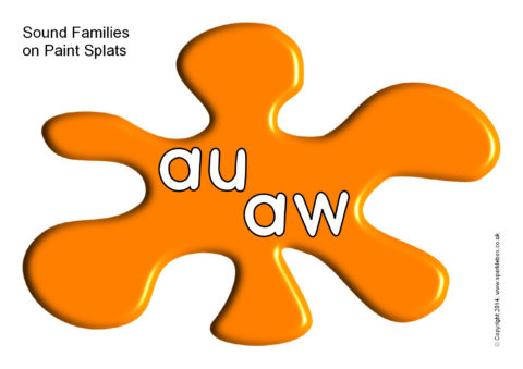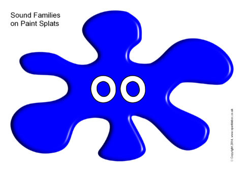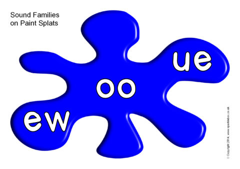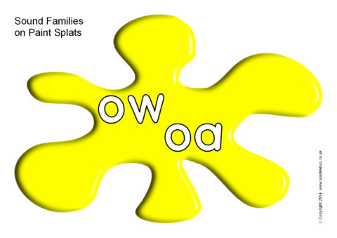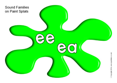 A selection of coloured paint splats featuring families of sounds / spelling patterns that link to the colour they are on. For example: green: ‘ee’ and ‘ea’; white: ‘Igh’, ‘ie’, ‘-y’; yellow; ‘ow’, ‘oa’ and more.
