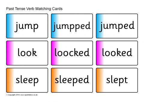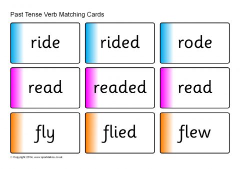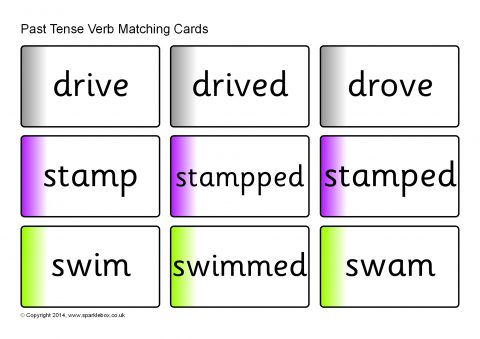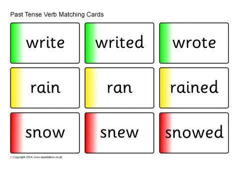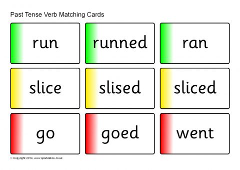 A set of printable word cards featuring different verbs in correct and incorrect past tense forms. Children match the correct past tense form to the corresponding verb.