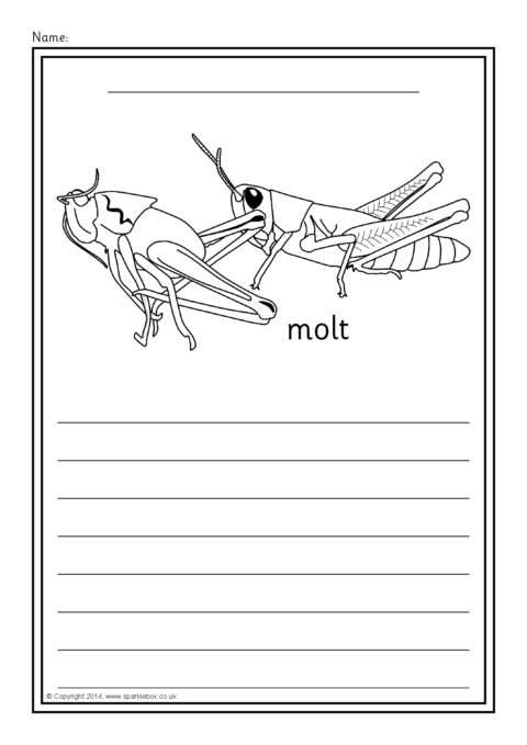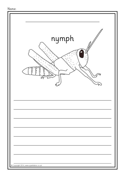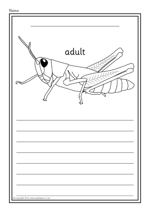 A set of simple printable sheets featuring images of grasshopper growth for children to colour along with writing lines for topic-related writing.