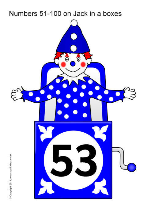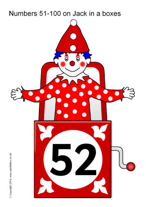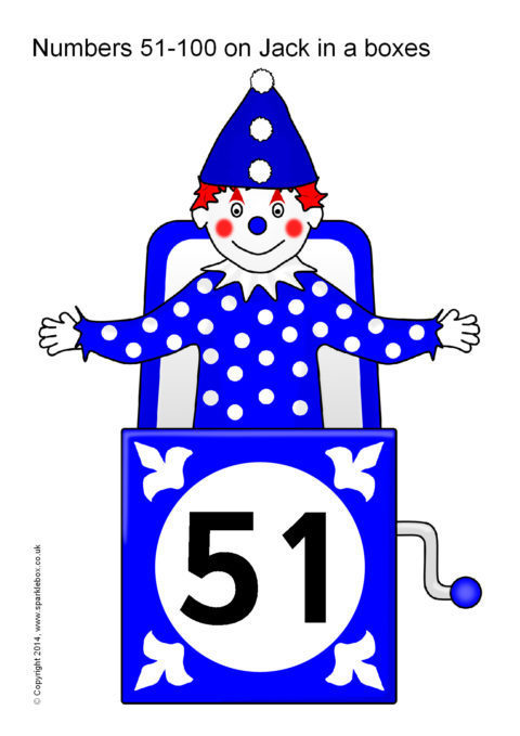 The numbers 51-100 presented on coloured Jack in a box toys.  An extension to our existing Numbers 0-50 on Jack in a boxes resource.