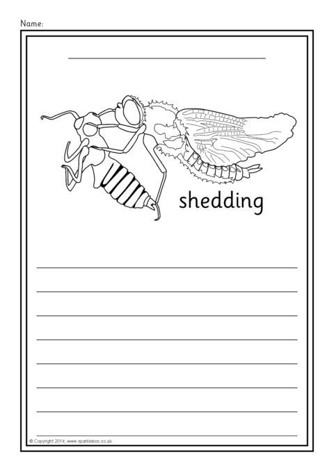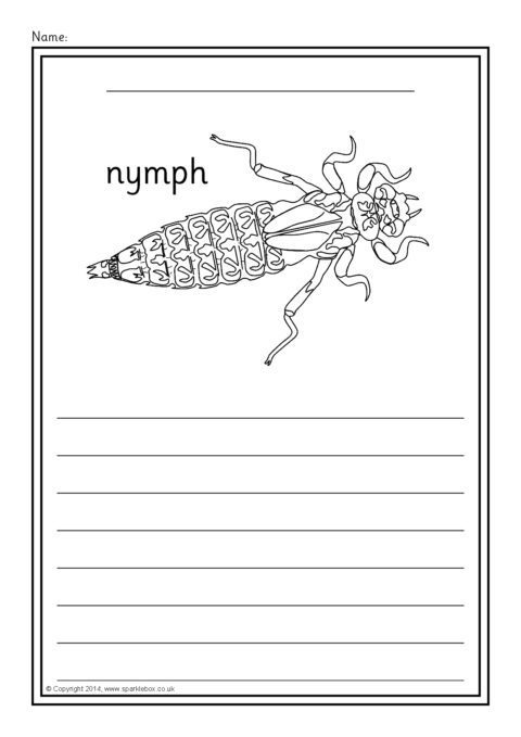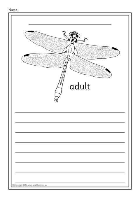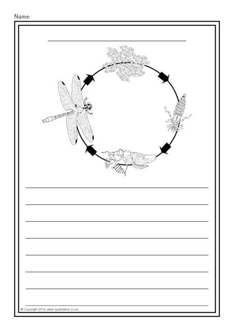 A set of simple printable sheets featuring images of dragonfly growth for children to colour along with writing lines for topic-related writing.