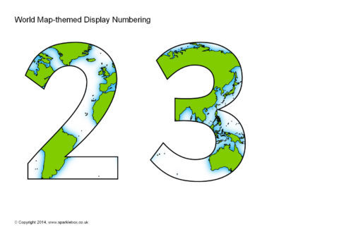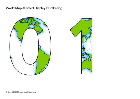 A set of cut-out numbers themed with a world map. Cut out and use to make headings on your classroom displays.