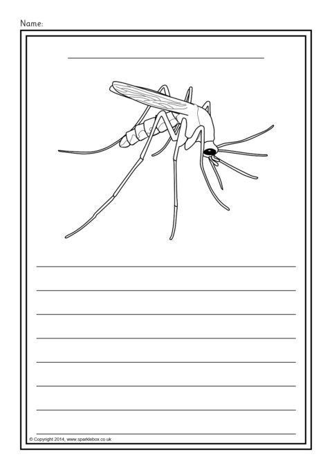 A set of simple printable sheets featuring images of mosquito growth for children to colour along with writing lines for topic-related writing.