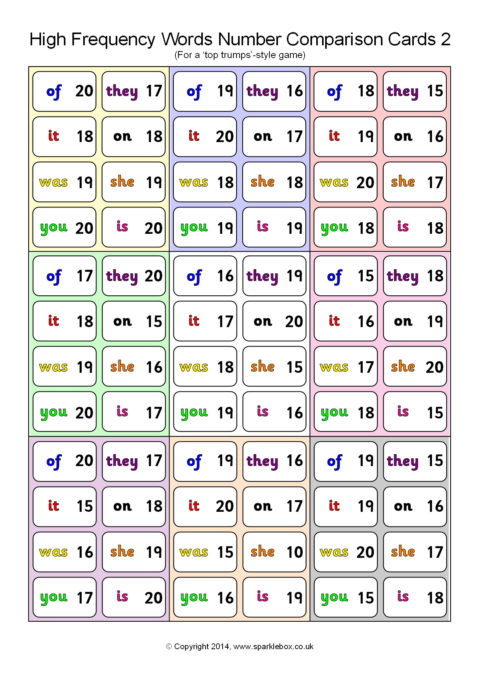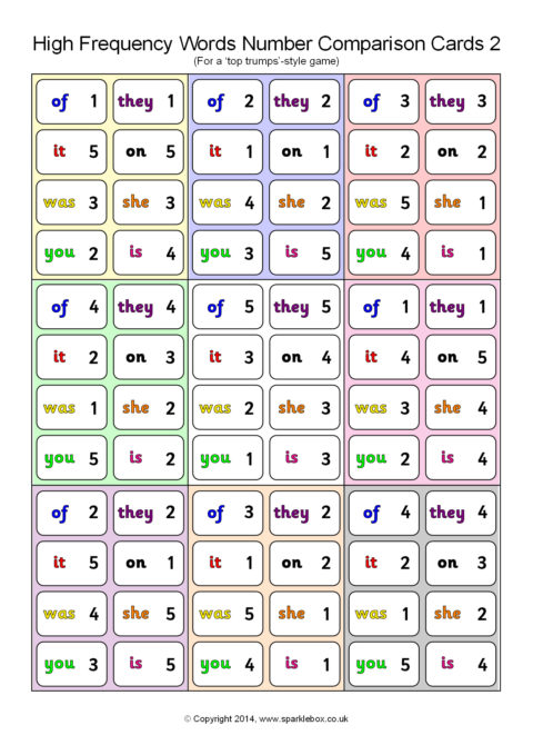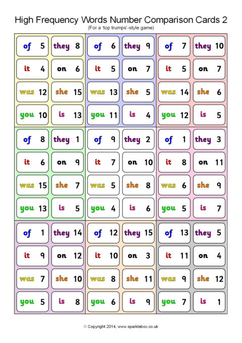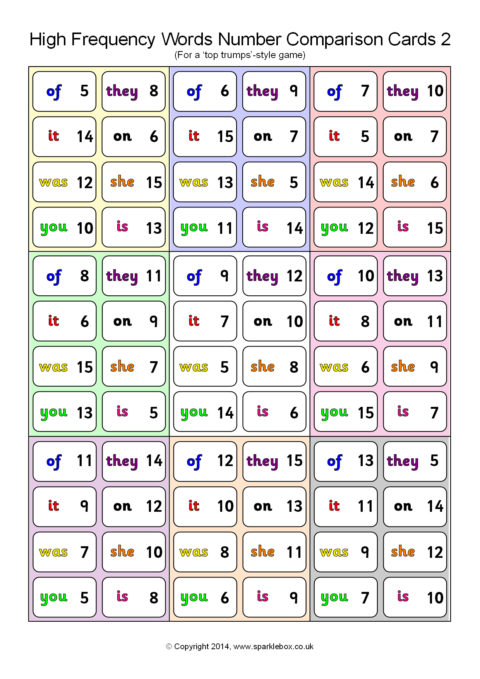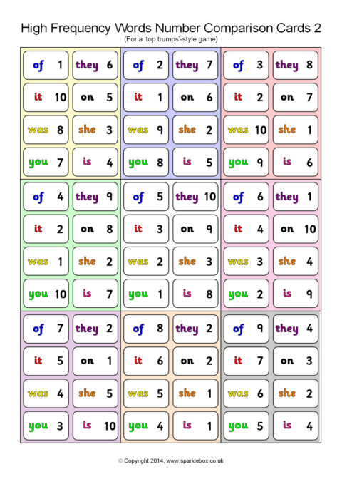 A set of 45 cards (9 per A4 page) for use in a ‘Top Trumps’-style game. Children each have a hand of cards and take turns to compare a high-frequency word and its number. The child with the highest number keeps the cards in each round.