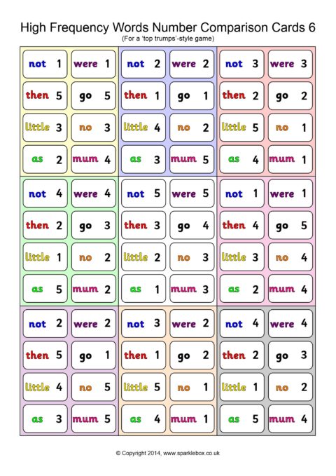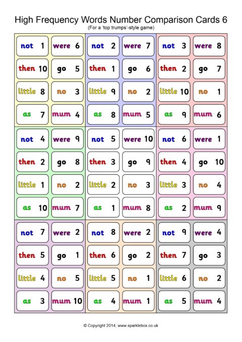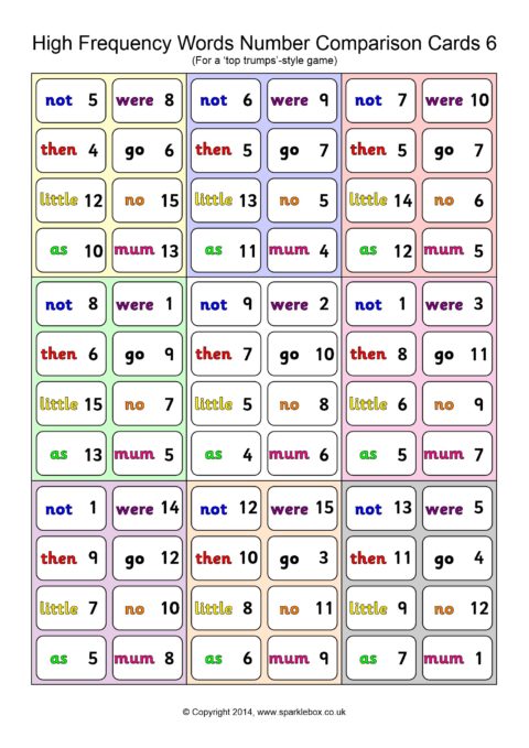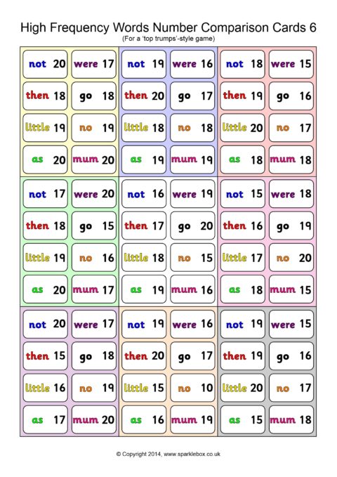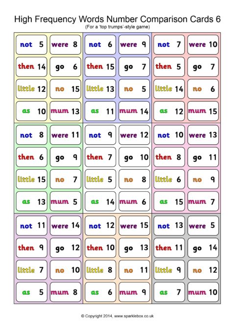 A set of 45 cards (9 per A4 page) for use in a ‘Top Trumps’-style game. Children each have a hand of cards and take turns to compare a high-frequency word and its number. The child with the highest number keeps the cards in each round.