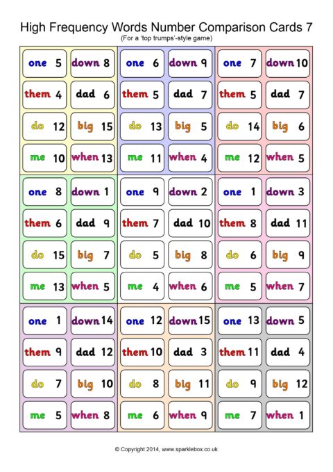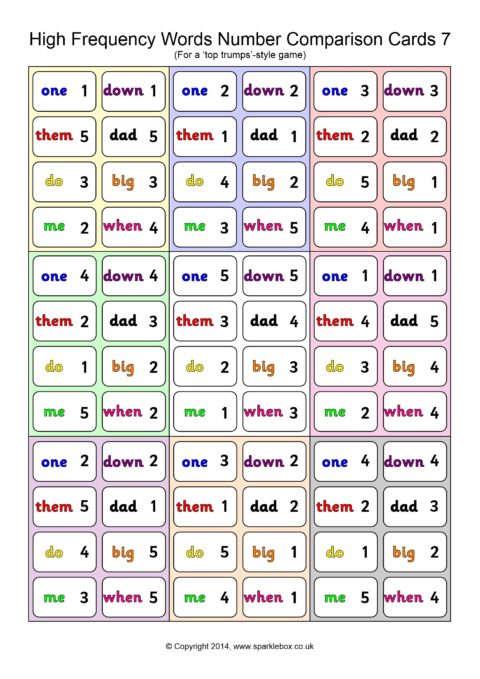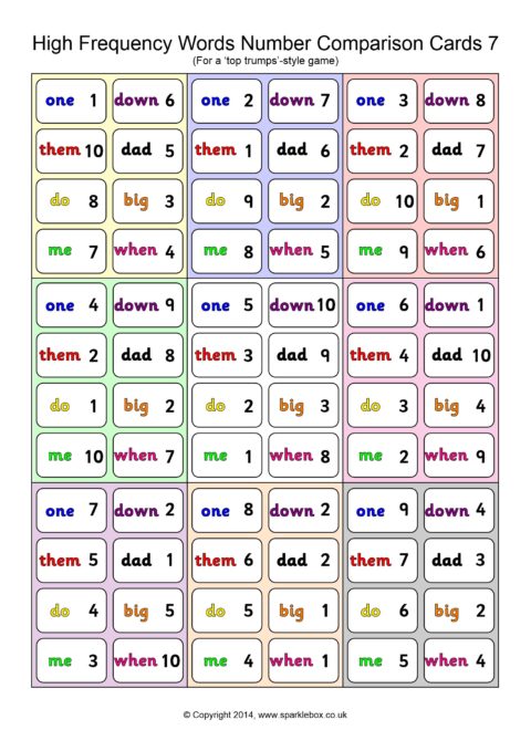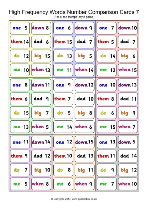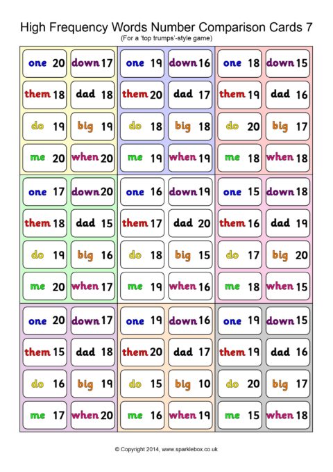 A set of 45 cards (9 per A4 page) for use in a ‘Top Trumps’-style game. Children each have a hand of cards and take turns to compare a high-frequency word and its number. The child with the highest number keeps the cards in each round.
