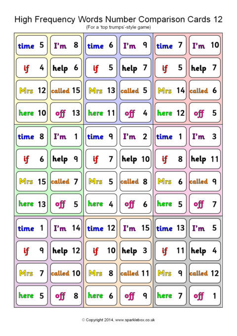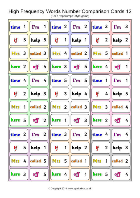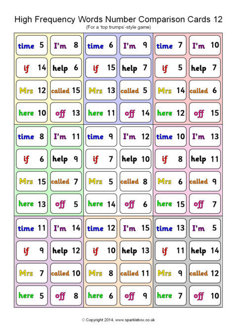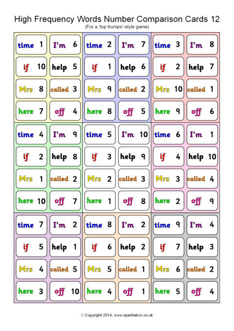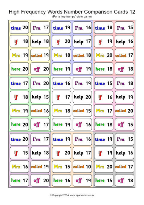 A set of 45 cards (9 per A4 page) for use in a ‘Top Trumps’-style game. Children each have a hand of cards and take turns to compare a high-frequency word and its number. The child with the highest number keeps the cards in each round.