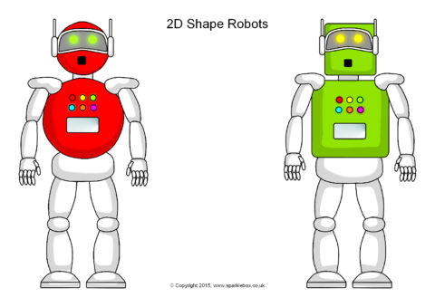 Printable robot pictures featuring heads and bodies in different 2D shapes.
