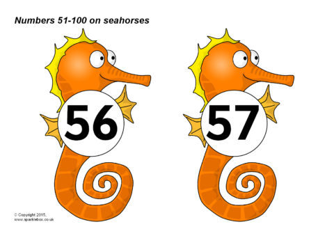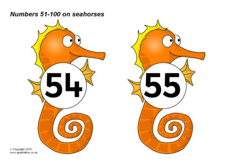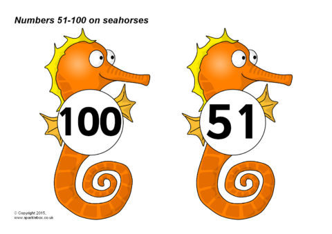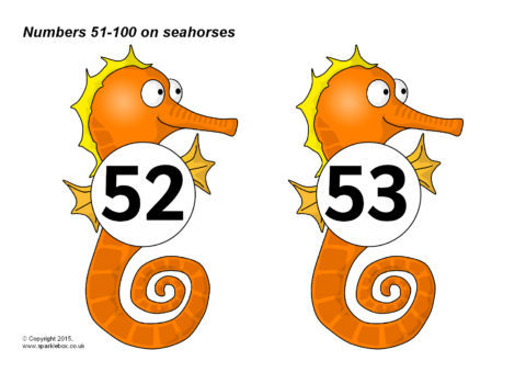 The numbers from 51 to 100 presented on cartoon seahorses. An extension to our existing Numbers 0-50 on seahorses resource.