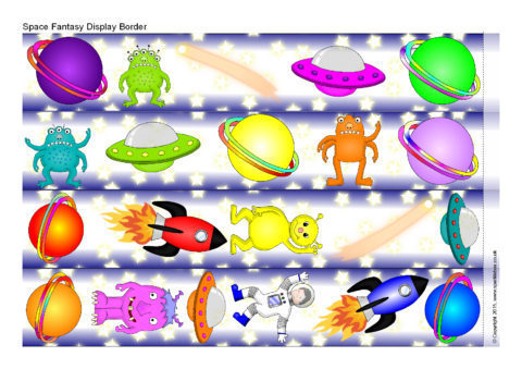 Printable border strips with a space fantasy theme to assemble around your classroom wall display board.