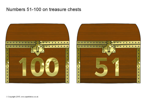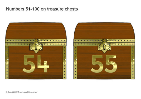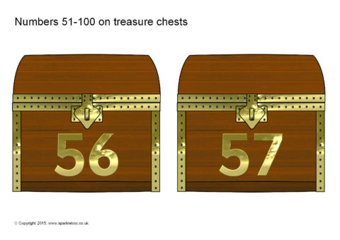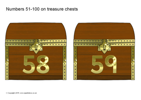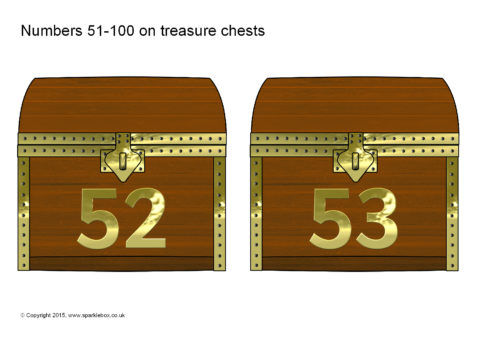 The numbers from 51 to 100 presented on pirate treasure chests. An extension to our existing Numbers 0-50 on treasure chests resource.