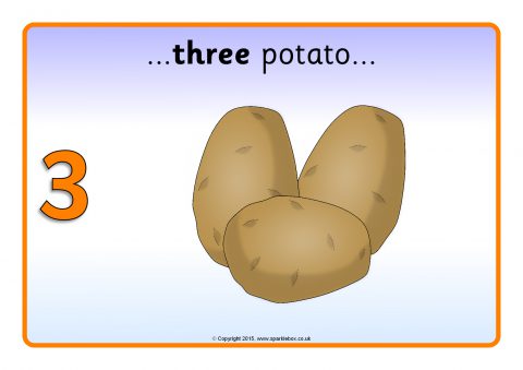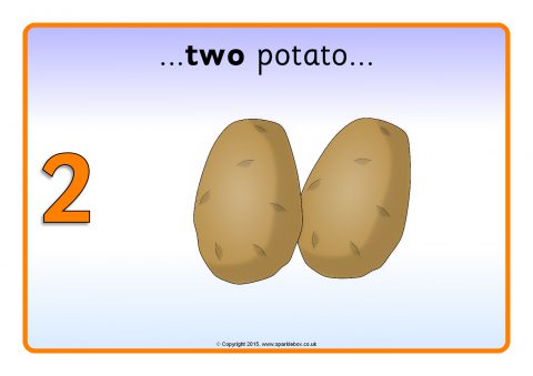 A set of printable visual aids to accompany the number rhyme, ‘One potato, two potato’.