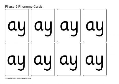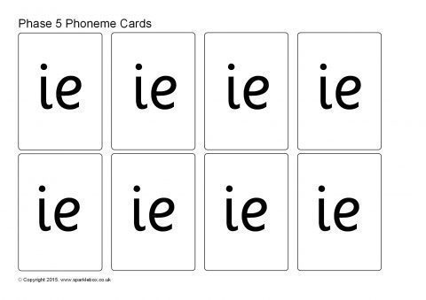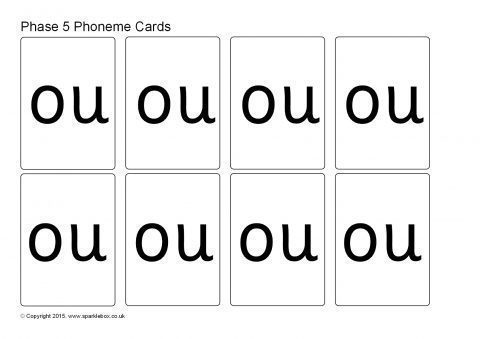 A set of printable cards (8 per A4 sheet) featuring the Phase 5 phonemes as listed in the DfES ‘Letters and Sounds’ publication.