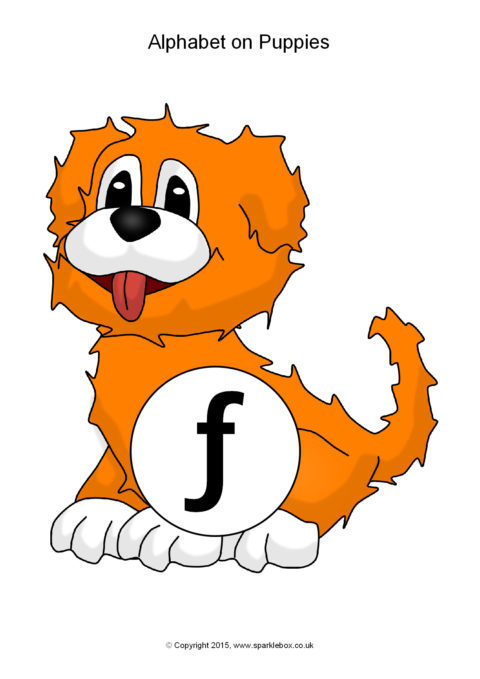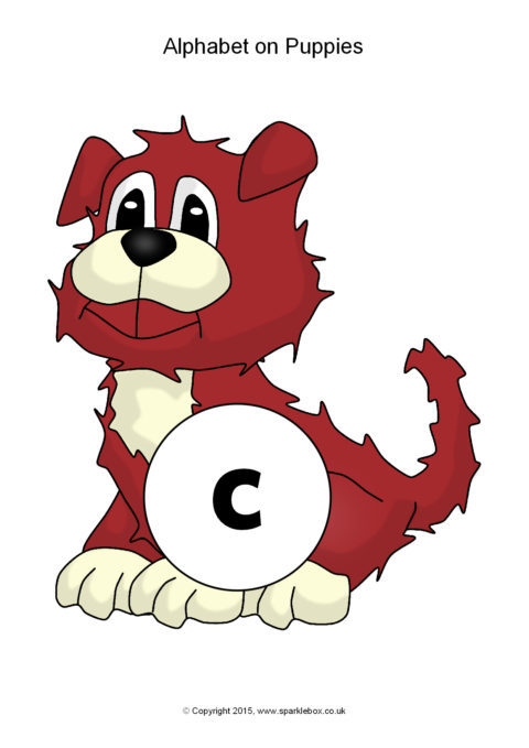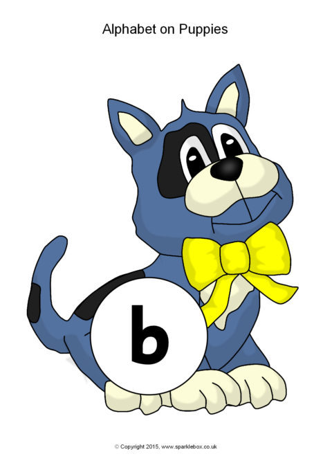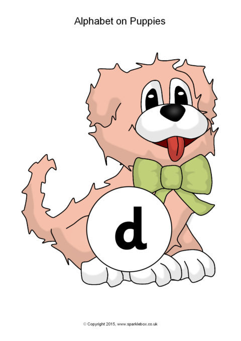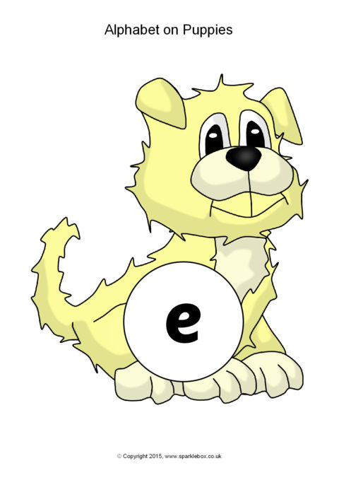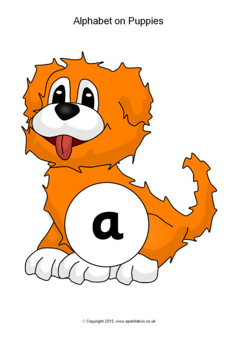 The lowercase alphabet presented on cute, colourful cartoon puppies.