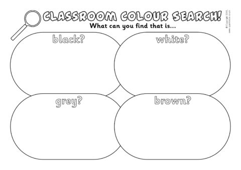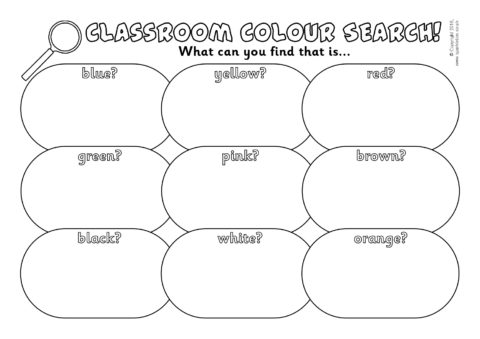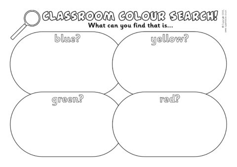 Simple printable worksheets in colour and black and white where children write or draw objects of different colours that they find around the classroom.