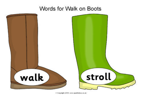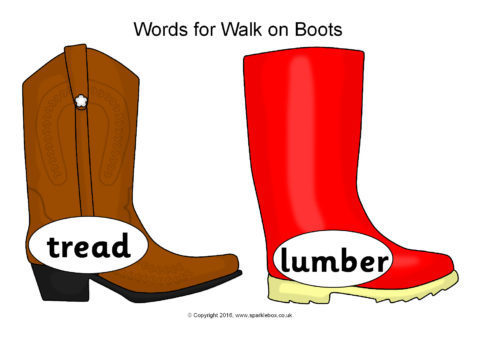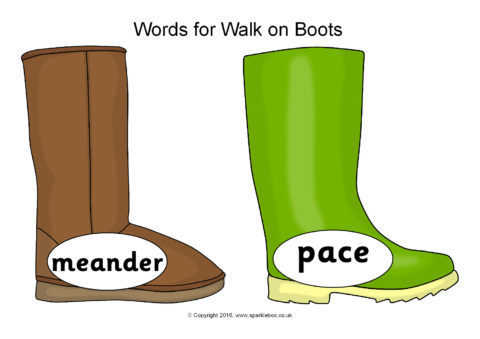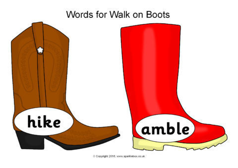 A set of printable boots (of different types) featuring interesting alternative words for the verb, ‘walk’.