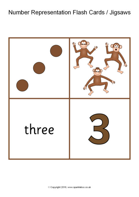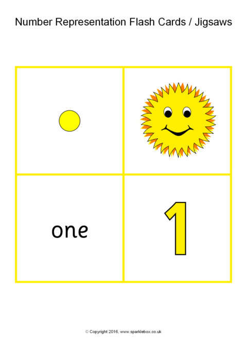 Printable flash cards / jigsaws featuring the numbers from 1 to 20 in numerals, words, spots and pictures.  You can cut these up for children to match up the corresponding parts.