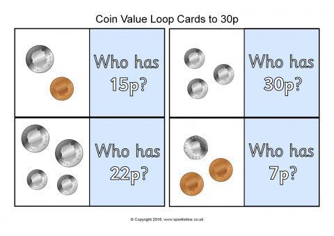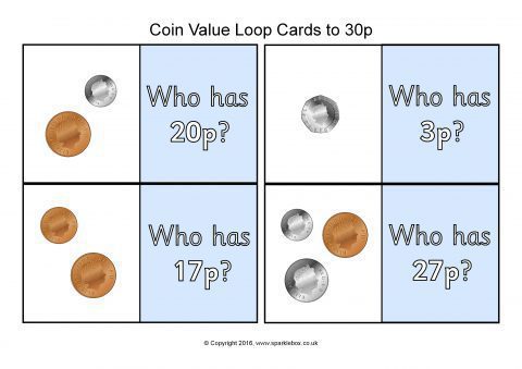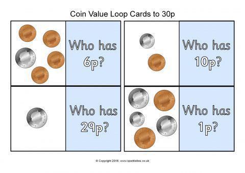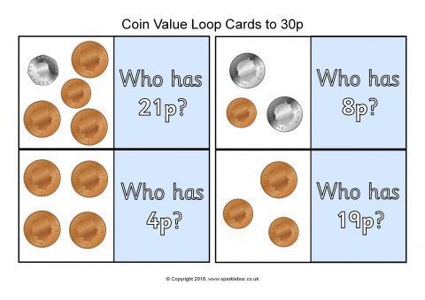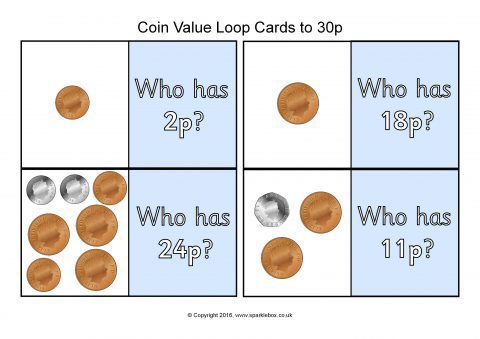 A set of printable follow-on cards featuring sets of coins with amounts up to 30 pence. Great for a whole-class game where one child calls out the start card and the pupils then match/call out the corresponding cards until the game ‘loops’ back to the original child.