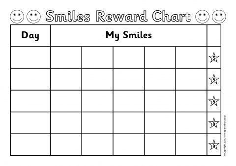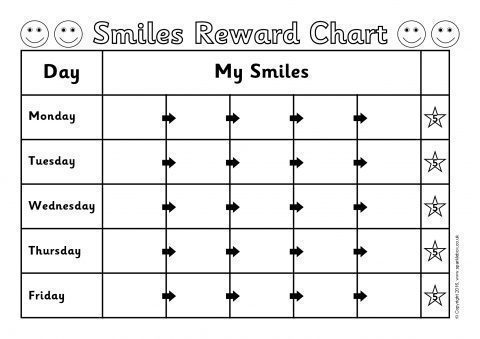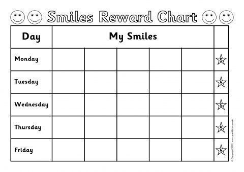 Printable 5-day reward charts where the child aims to collect 5 smiles for good behaviour during each day and earns a star (or a reward).