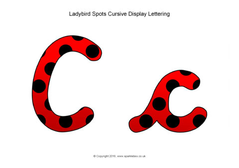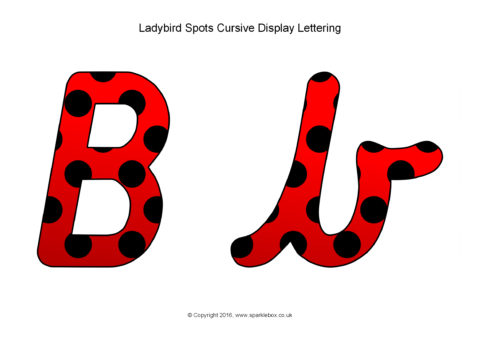 A PDF document with 26 alphabet letters (upper and lowercase) in cursive script textured with a ladybird pattern.  These are great for printing and cutting out for use on displays.