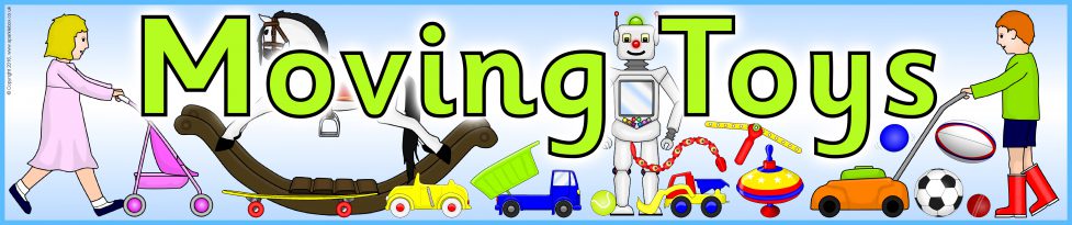 A banner that prints over 3 landscape pages for your classroom wall display about toys that move.