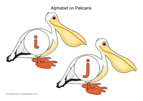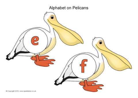 The lowercase alphabet letters presented on cartoon pelican characters.