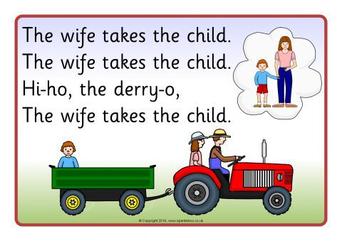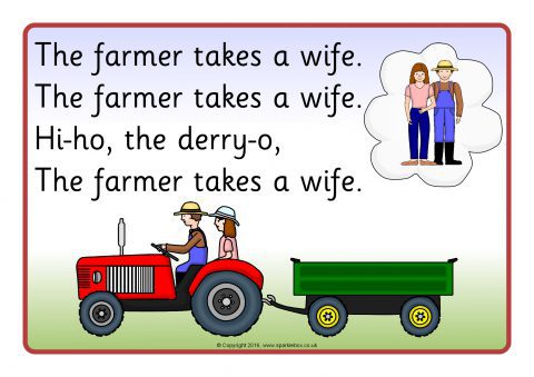 A set of simple A4-size visual aids for use when singing the traditional nursery rhyme, ‘The Farmer's in the Dell'.