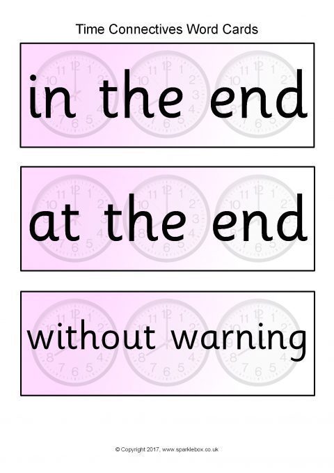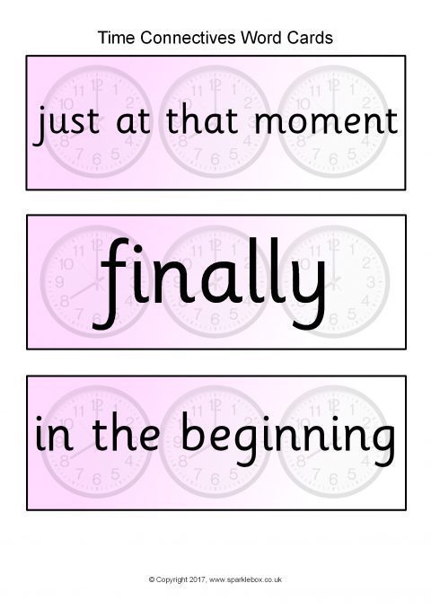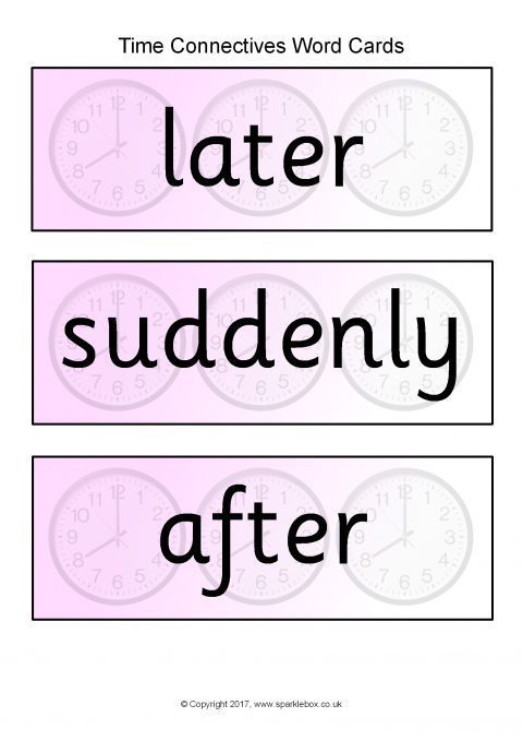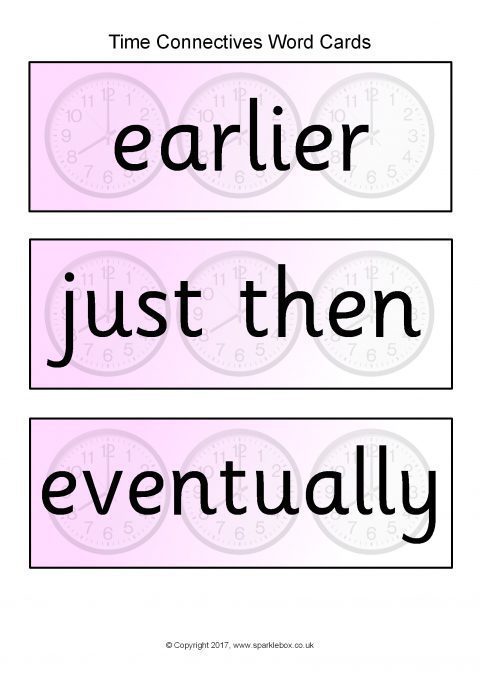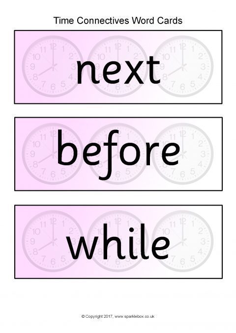 Printable word cards featuring various useful connectives/conjunctions related to time. Great for use as aids for recount writing.