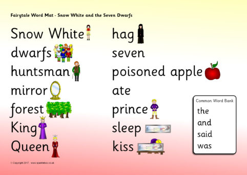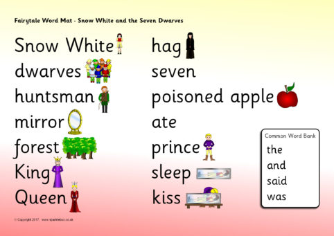 A printable desktop mats featuring words and pictures from the popular traditional tale of ‘Snow White and the Seven Dwarfs’.