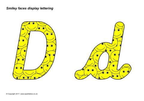 A PDF document with 26 alphabet cursive letters (upper and lowercase) patterned with yellow smiley faces.  These are great for printing and cutting out for use on displays.