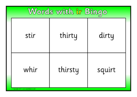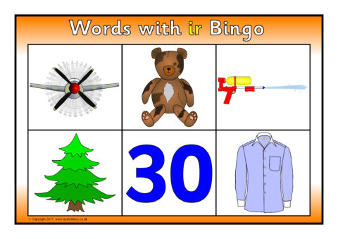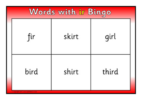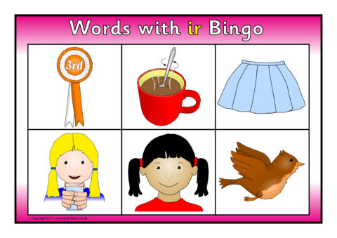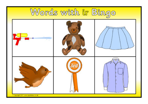 Printable bingo boards and picture cards where children match the pictures to the words with the sound ‘ir’.