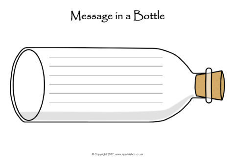 Simple writing frames featuring a corked bottle with several lines for children to write their own 'message in a bottle'.