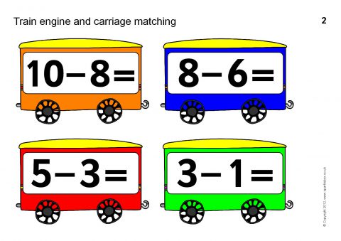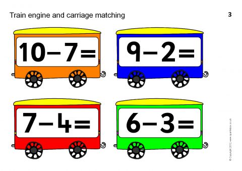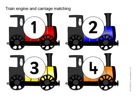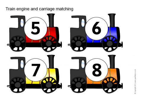 Printable train engines with numbers 0 to 10 and carriages with number sentences. Create a matching activity where children match the carriages to the corresponding engines.