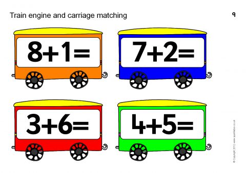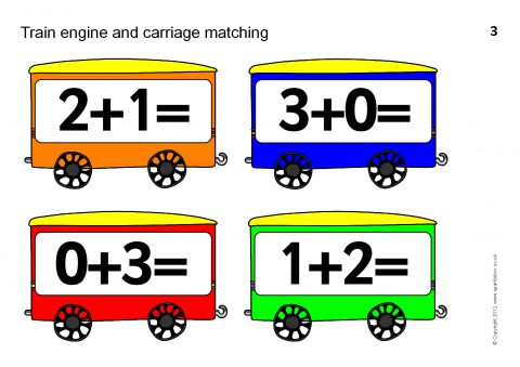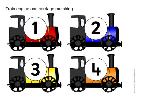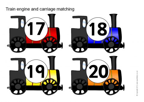 Printable train engines with numbers 0 to 20 and carriages with number sentences. Create a matching activity where children match the carriages to the corresponding engines.