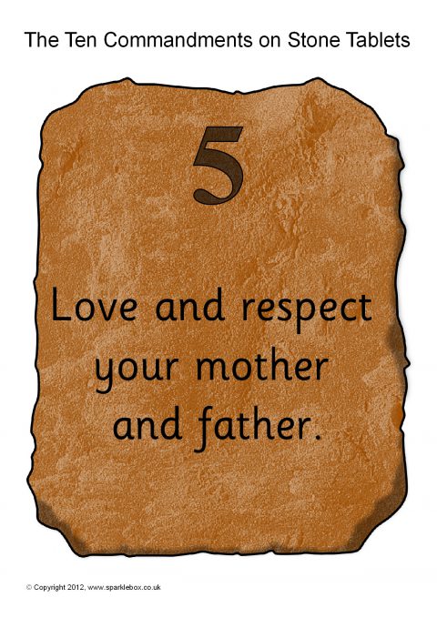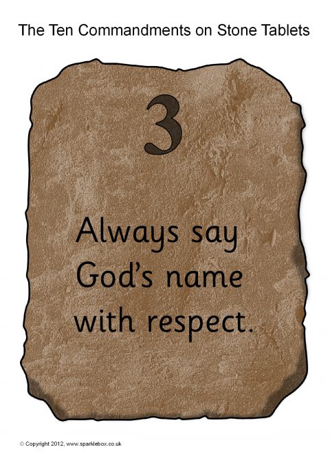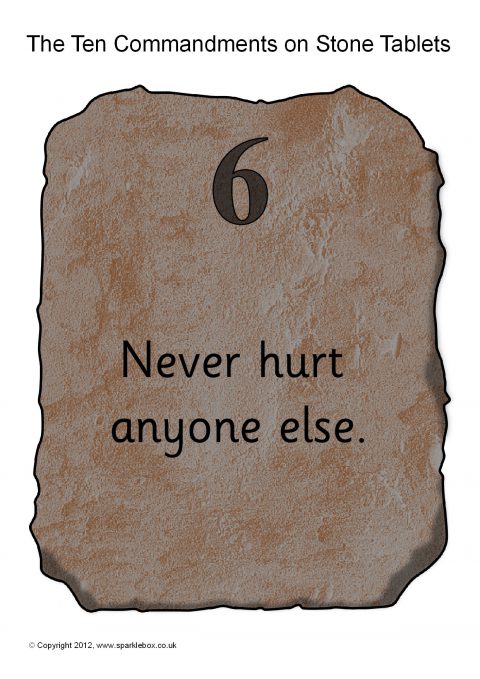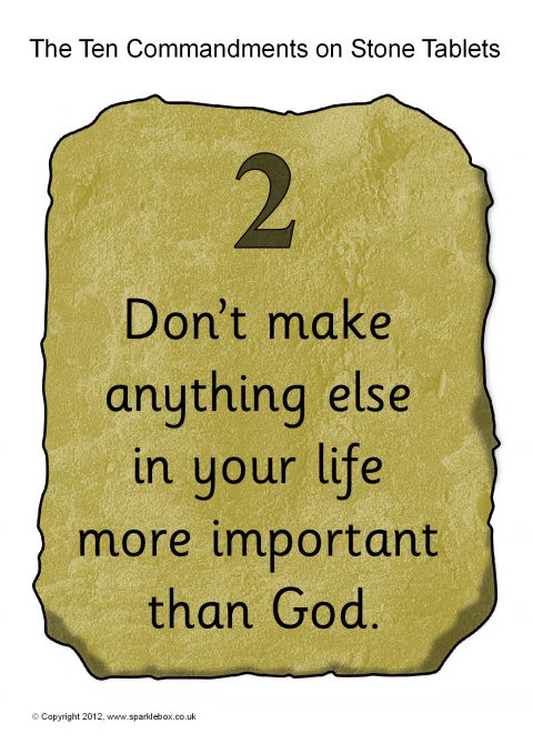 The Biblical Ten Commandments presented on coloured stone tablets. Includes a simplified version for younger children.
