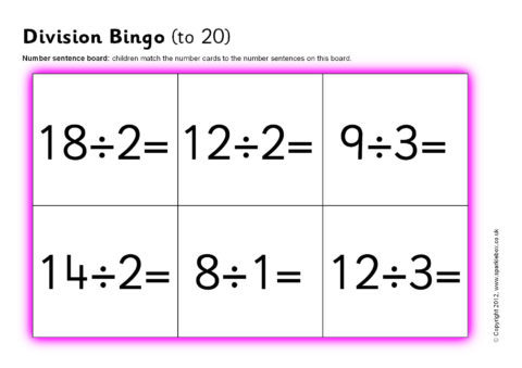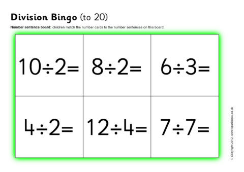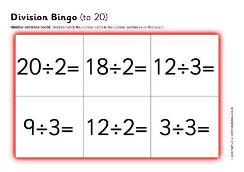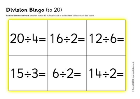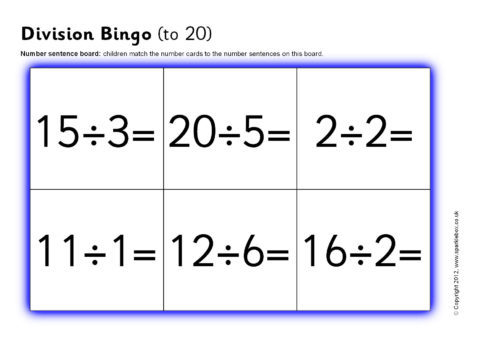 A set of printable bingo boards and number cards featuring division number sentences using numbers to 20.