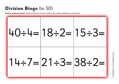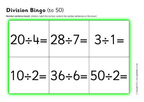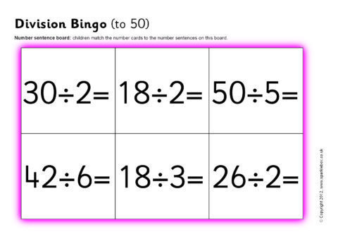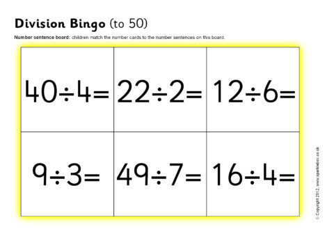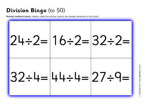 A set of printable bingo boards and number cards featuring division number sentences using numbers to 50.