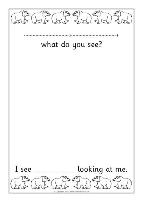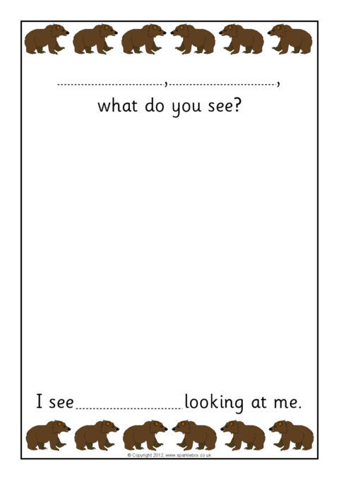 Simple page templates to accompany the story of ‘Brown Bear, Brown Bear What Do You See?’ by Bill Martin, Jr. Children write their name and what they can see, with space for a picture.