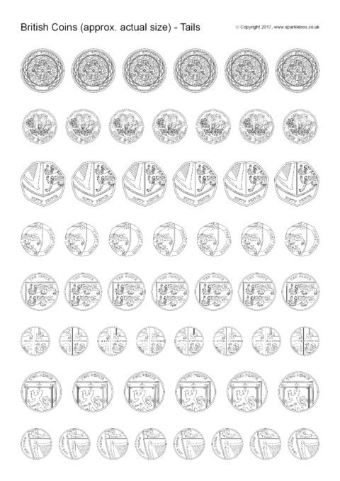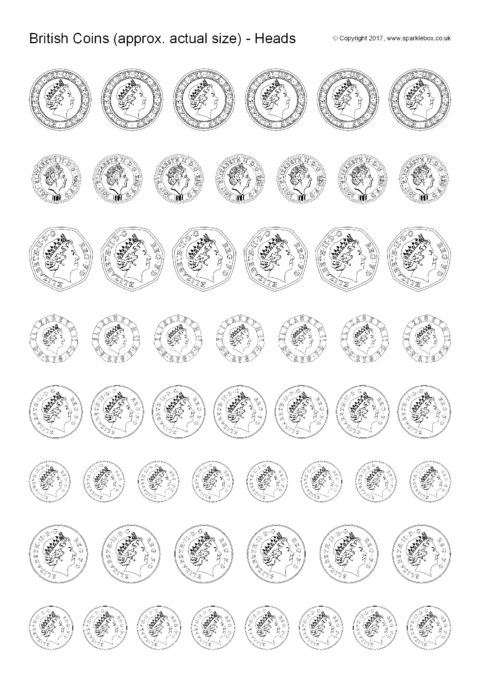 A PDF document with the British coin heads and tails images at actual size (or very close to!). The coins can be printed for children to colour and use in all sorts of money-related activities.