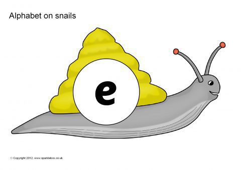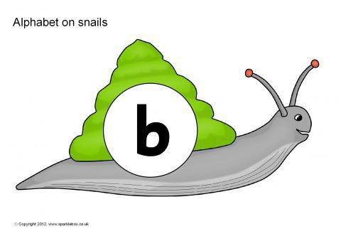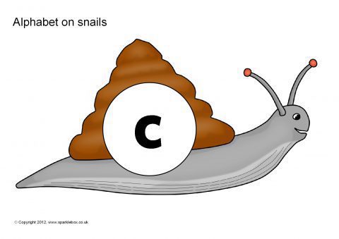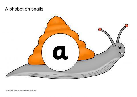 The lowercase alphabet letters presented on cartoon snails with coloured shells.