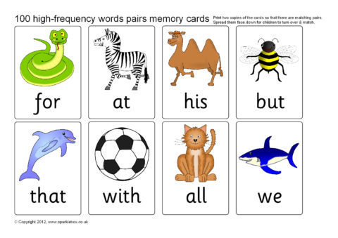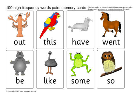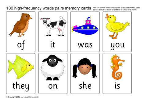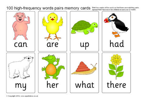 A set of 100 word and picture cards. Print out two copies and make into sets of pairs for memory games where children turn over the cards and match the pairs.