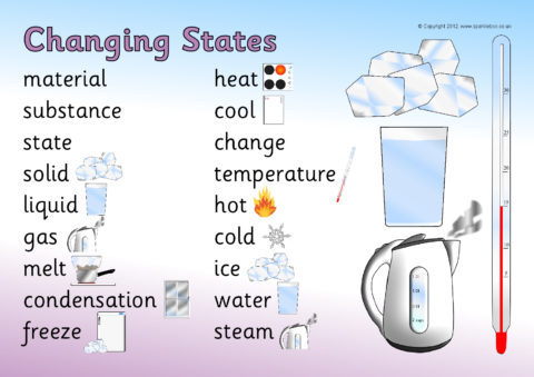 A printable word mat featuring words and pictures linked to a topic on changing states.